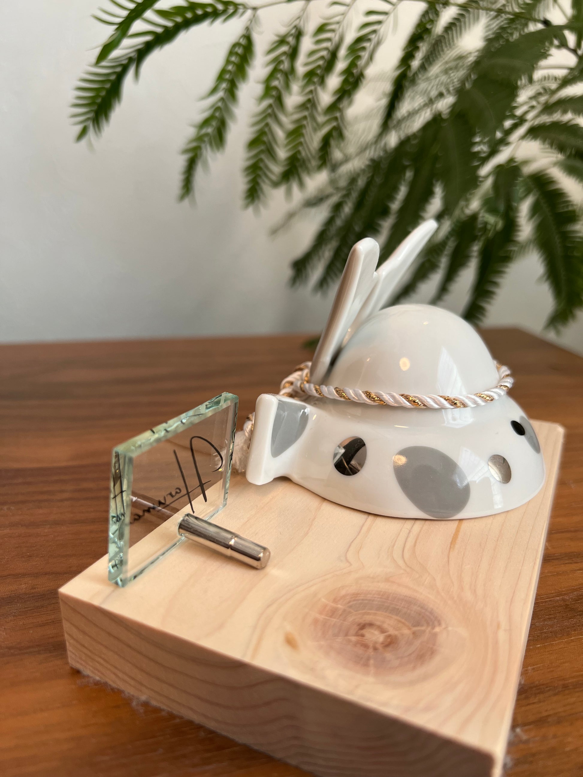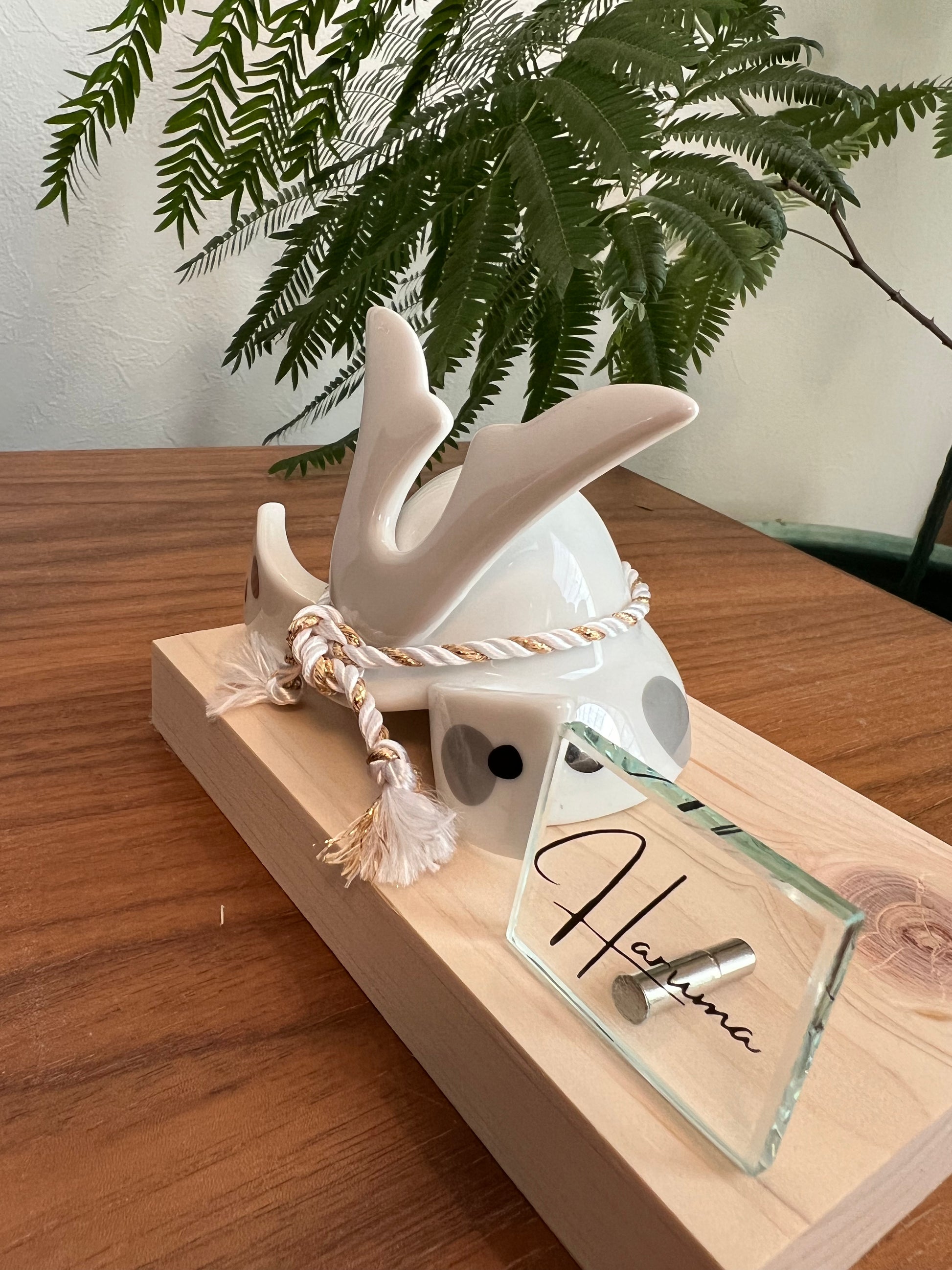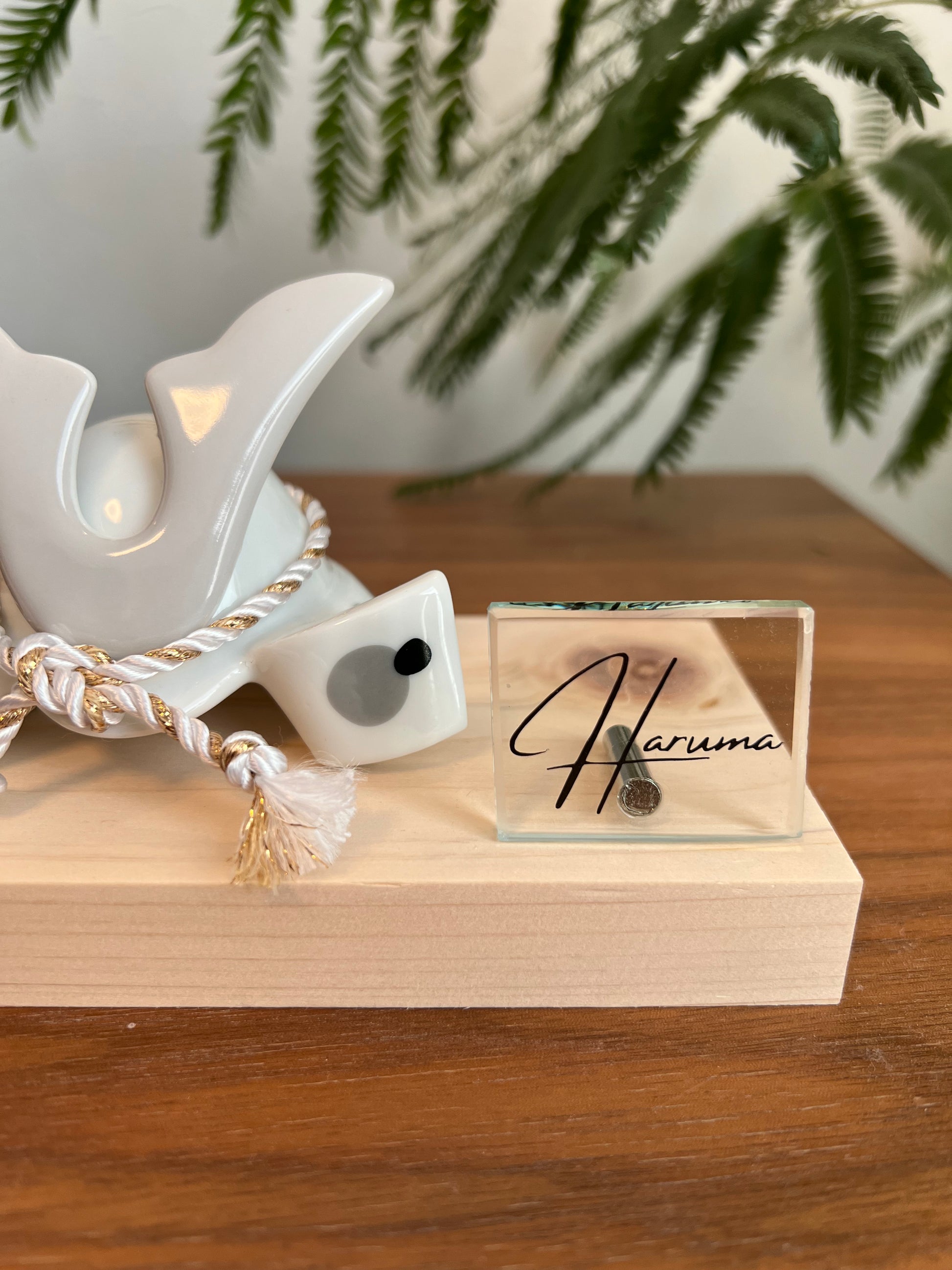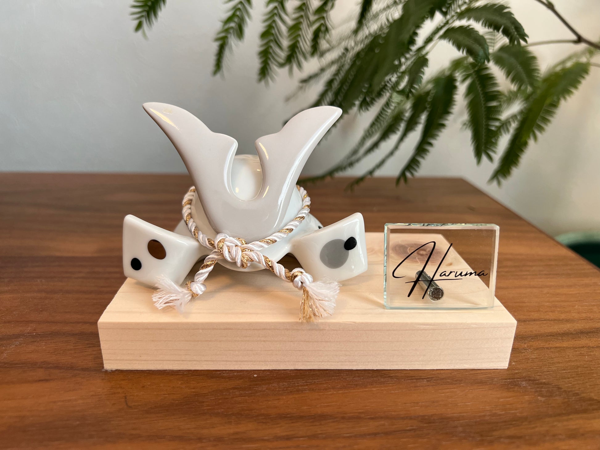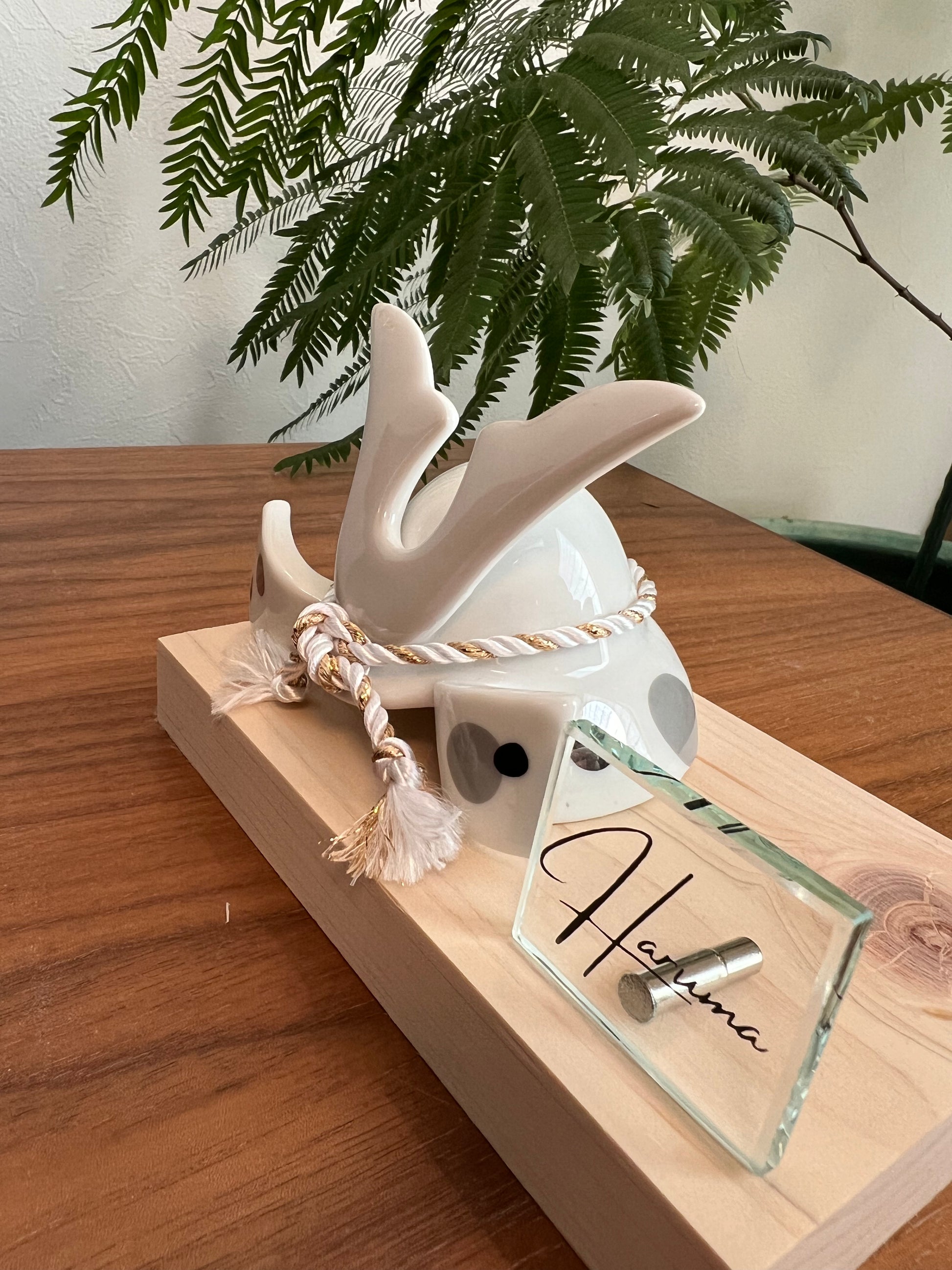 兜は陶器、名入れ札は厚みのあるガラス板にステンレスの金具で高級感があります。