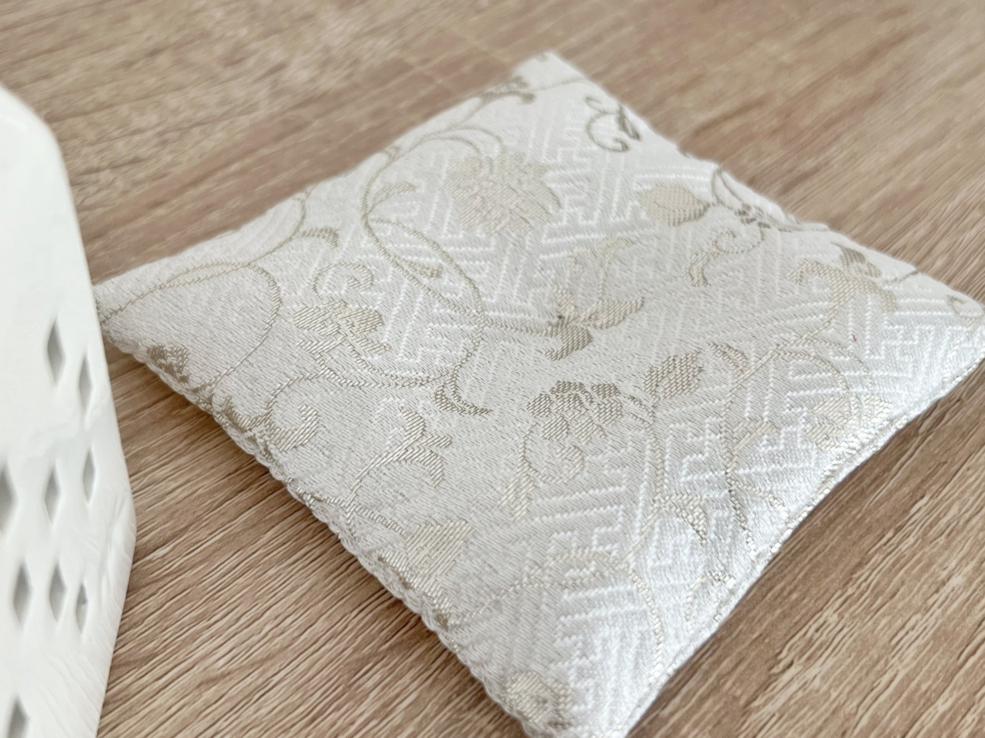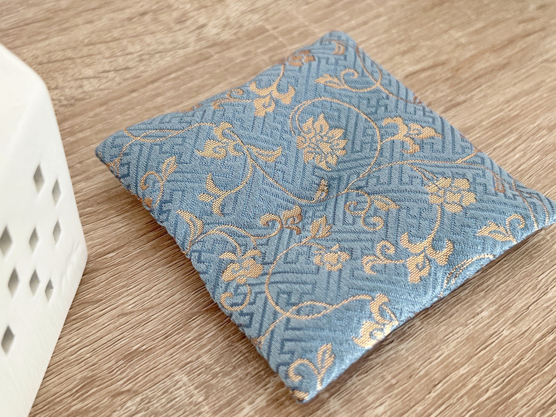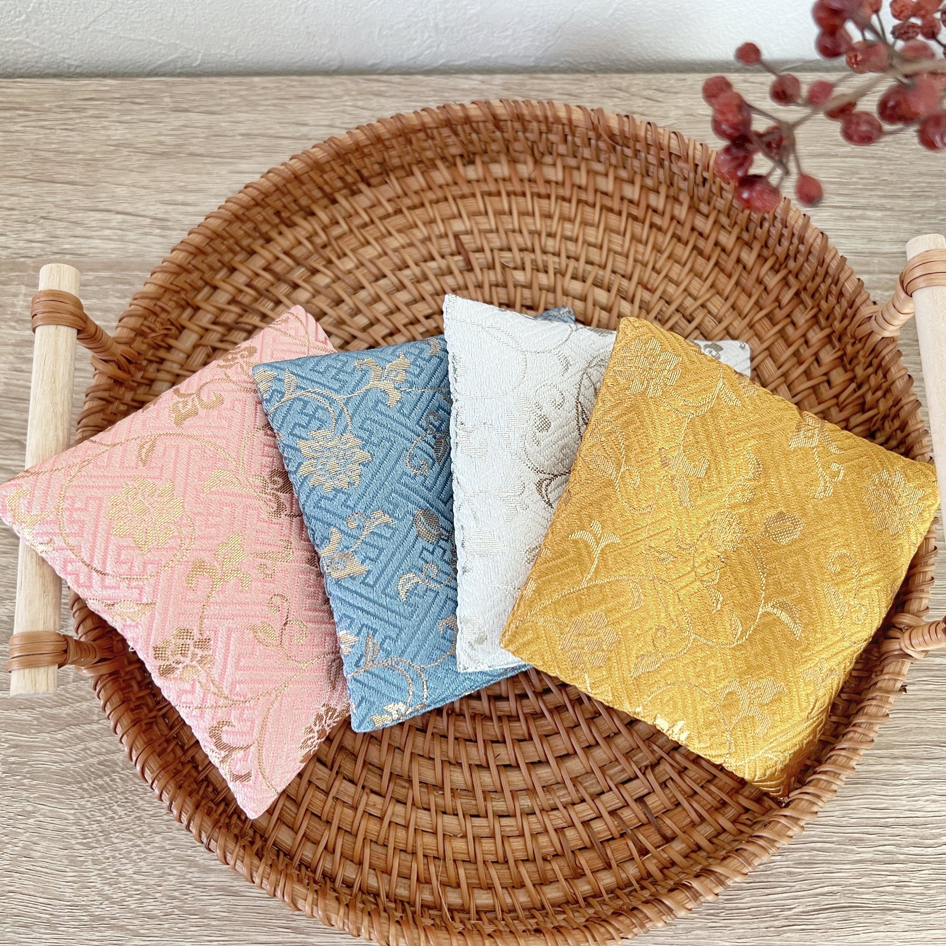 「金襴」とは糸に金箔を巻きつけた金糸や、細く切った金箔を織り込み、紋様を顕わした布地のことを言います。 織物の中でも特に豪華で黄金色に輝く豪奢な文様は数ある布地の中でも最高の位に入る織物です。